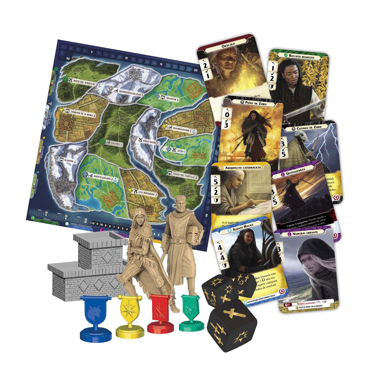 El tablero central muestra un gran mapa dividido en 12 provincias, que los jugadores podrán conquistar. Cada provincia pertenece a uno de los 4 reinos, necesitada en su tipo de terreno: en el bosque tienen su morada las naciones forestales; en los cerros, el imperio de los clanes de Montaña; en las llanuras residen los ciudadanos del valle sagrado y los ríos están controlados por la soberanía fluvial. Además de los súbditos de cada reino, encontramos 5 facciones que nos permitirán mejorar nuestra mano de cartas: los Comunes, los Señalados, las Hordas de Zurd, los Señores Gremiales Halax y los Numerai. Cada una de estas facciones está especializada en aspectos concretos, como el combate o la construcción, y sirve para enfocar la estrategia que queramos tomar durante la partida. A través de mecánicas de construcción de mazos,
