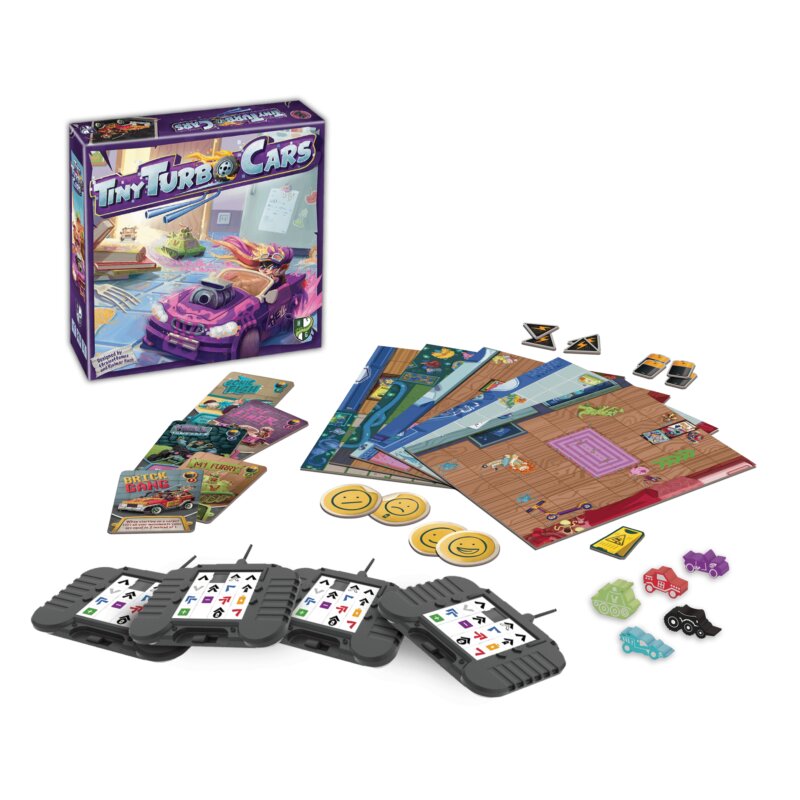 Tiny Turbo Cars es un frenético juego de carreras para 2 a 4 jugadores en el que programa los movimientos de su pequeño coche de juguete con anticipación, con un rompecabezas deslizante que actúa como su control remoto.